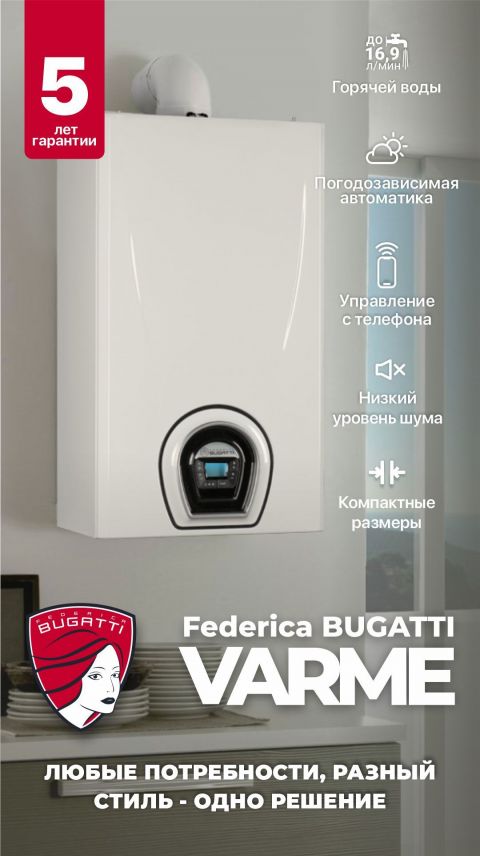 G24F1 | Котел газовый настенный Federica Bugatti Varme -24 кВт с дисплеем (двухконтурный) | 66625р. |